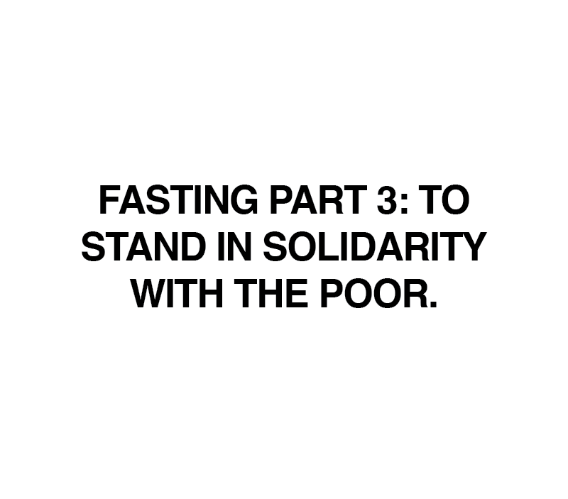 What Isaiah presents is another dimension of fasting as a spiritual practice: fasting as standing in solidarity with the poor. When we choose this fast, we choose to allow our bodies to feel hunger and this hunger becomes an act of solidarity with those who are hungry by no choice of their own. We align our bodies to connect with those suffering. We choose to unite our hearts to those experiencing injustice of all kinds: systemic poverty, slavery, hunger, homelessness, racism, debt, etc.